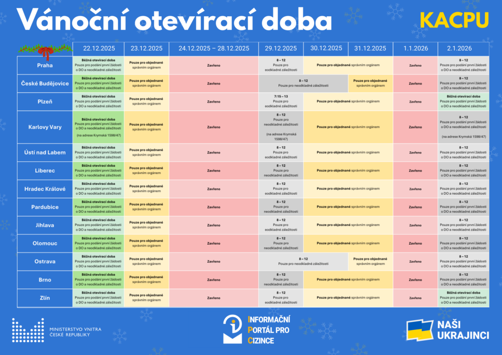 Krajská asistenční centra pomoci Ukrajině budou mít v období vánočních svátků od 22. 12. 2025 do 2. 1. 2026 upravenou provozní dobu.